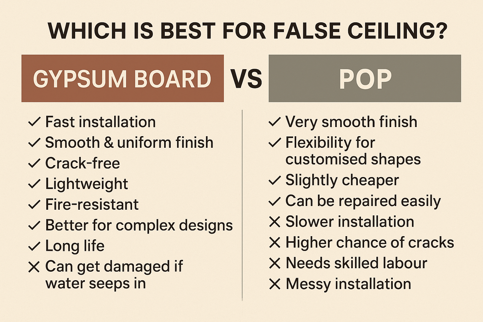 Important: POP may look cheaper, but maintenance and repair costs make gypsum more economical long-term.