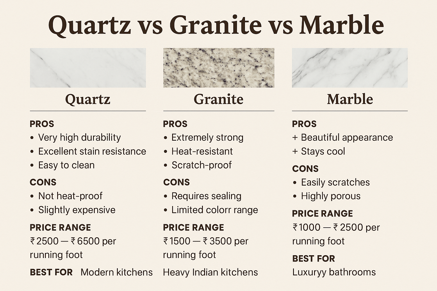 ✔ If your kitchen involves heavy Indian tadka → Avoid Marble